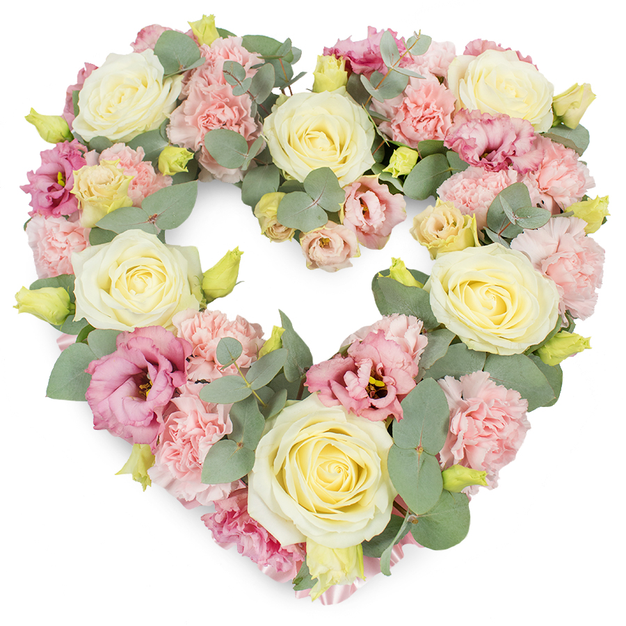 Express your heartfelt emotions with our charming open heart floral arrangement. This beautiful bouquet combines elegant white roses, vibrant pink carnations, delicate pink lisianthus, and aromatic eucalyptus leaves, artfully arranged to symbolize love and remembrance.