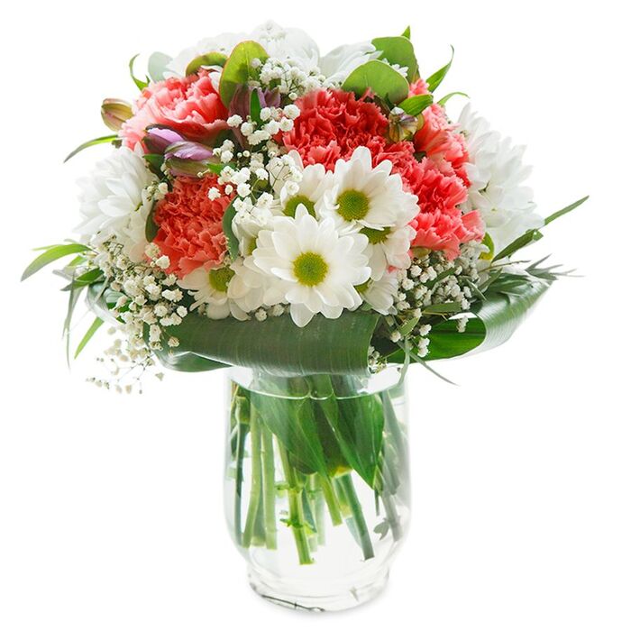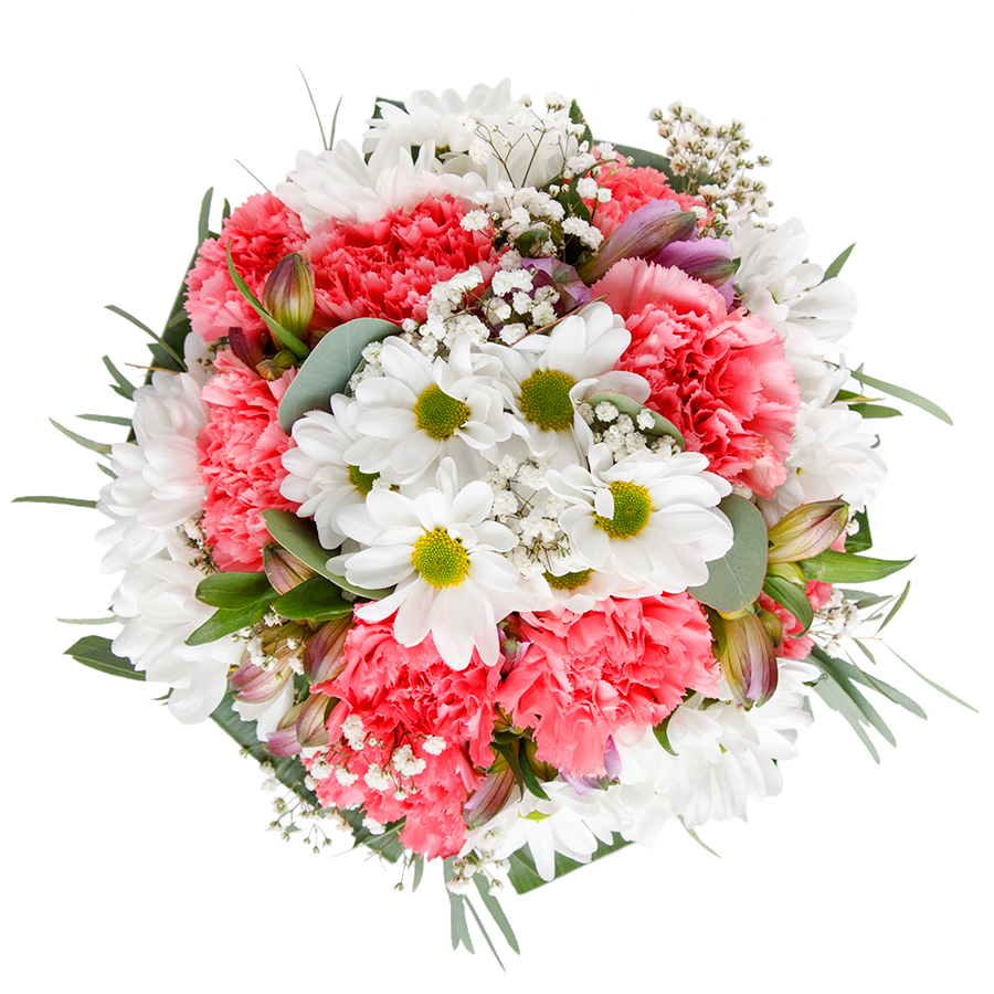 Bring joy with our lovely and unique flower arrangement. This seasonal bouquet features a harmonious blend of snow-white chrysanthemums, delicate gypsophila, and soft light pink carnations, elegantly arranged with vibrant aspidistra leaves.